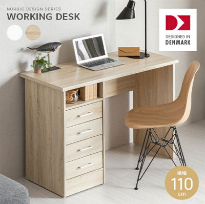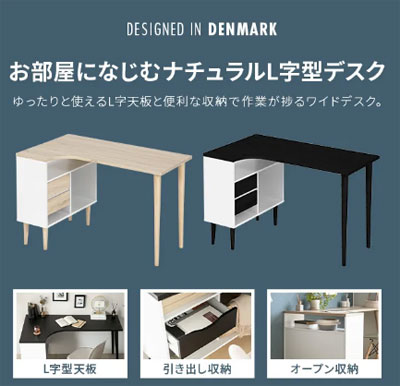 人気のデンマークデザインワークデスクは木目を活かしたオーク調の素材を中心に、ホワイトまたはブラックのバイカラーがアクセントなっています。